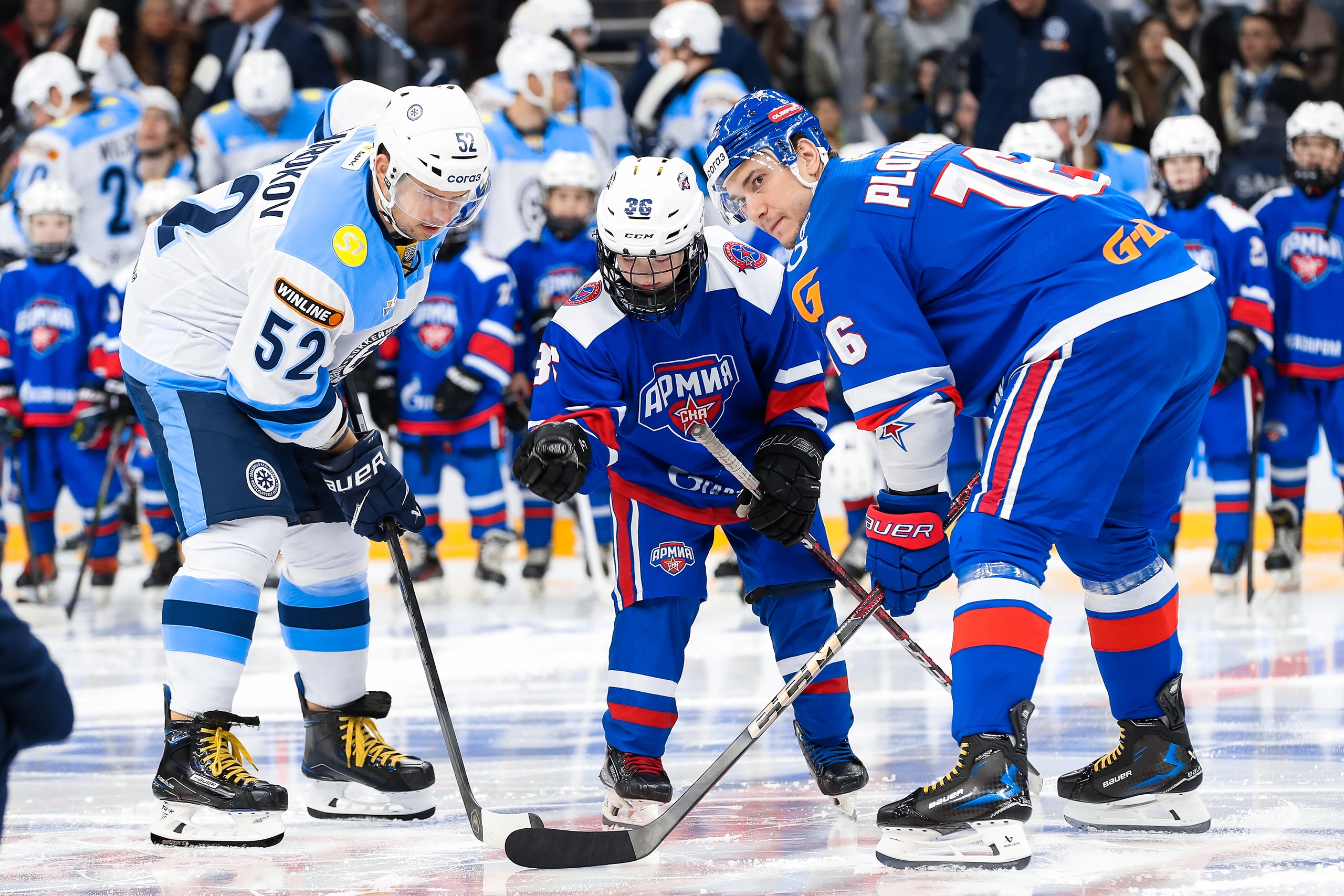 Ребята вышли на лед вместе с игроками СКА, громко-громко спели гимн, а капитан команды Леонид Парамонов произвел символическое вбрасывание! Парням удалось и поиграть в хоккей при многотысячной аудитории.